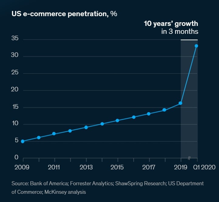وفقًا لماكينزي ، شهدت التجارة الإلكترونية نموًا لمدة عشر سنوات في ثلاثة أشهر فقط بسبب أزمة COVID-19.