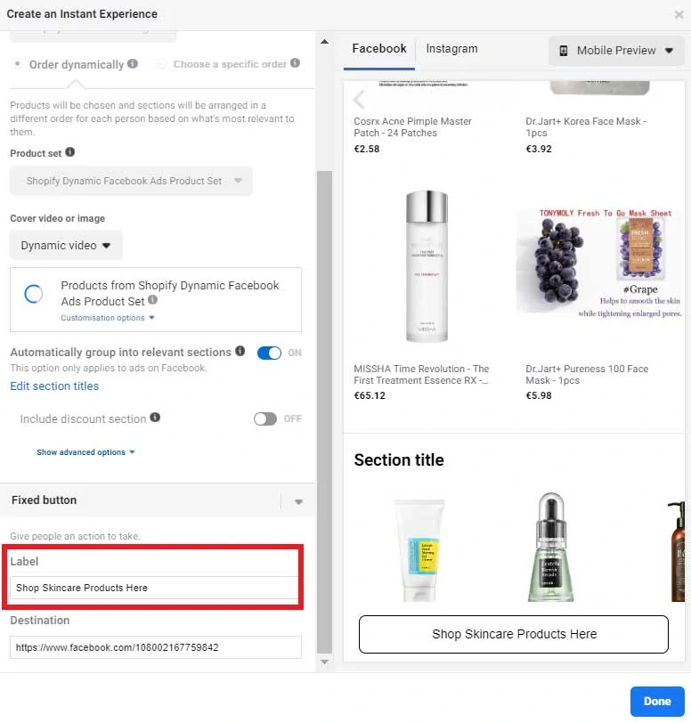 - أنت الآن بحاجة إلى إعداد واجهة متجرك الافتراضية عن طريق إضافة عنوان إلى كتالوج المنتج الخاص بك. يمكنك اختيار ما إذا كنت تريد جعل غلاف الإعلان فيديو ديناميكيًا أو صورة. بمجرد الانتهاء من ذلك ، أضف نص الحث على اتخاذ إجراء إلى "الزر الثابت" وانقر فوق تم .