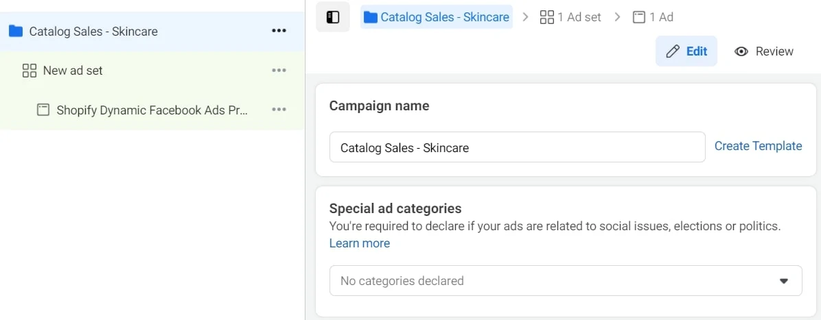 - حدد Shopify كتالوج وقم بتسمية حملتك.