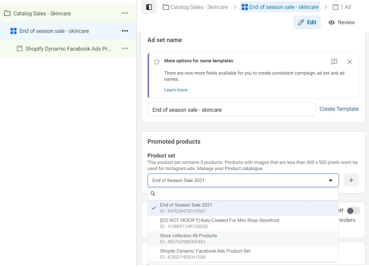- حدد مجموعة المنتجات الخاصة بك وقم بتسمية مجموعة إعلانك