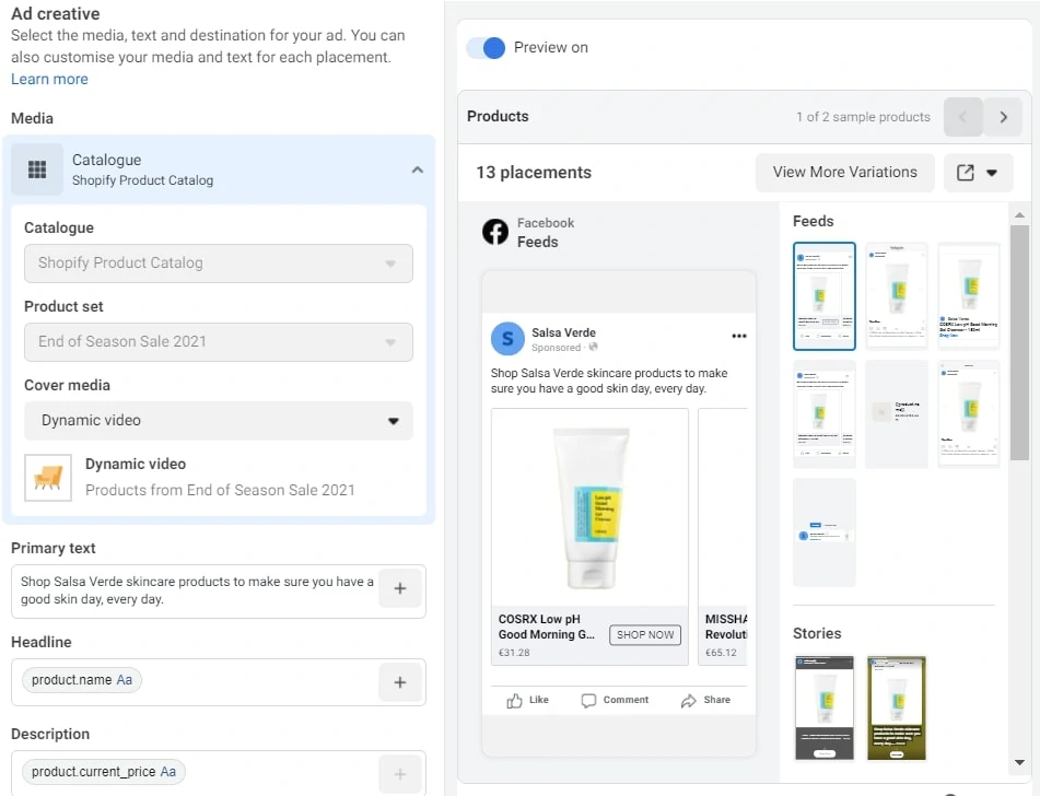 بخلاف إعلانات Facebook الأخرى ، تتطلب إعلانات الكتالوج أو التسوق استخدام كلمات رئيسية خاصة (هذه الكلمات الرئيسية هي الرؤوس التي استخدمتها لتغذية منتجك في Shopify). بمساعدة هذه الكلمات الرئيسية ، سيقوم Facebook تلقائيًا بتعبئة إعلاناتك بمعلومات المنتج ذات الصلة عند عرض الإعلانات.