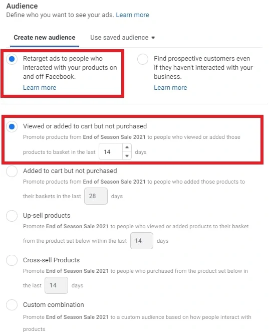 انظر إلى الخيارات أدناه وحدد ما تريد استهدافه. في هذه الحالة ، اخترنا استهداف الأشخاص الذين شاهدوا أو أضافوا إلى سلة التسوق ولكنهم لم يشتروا.