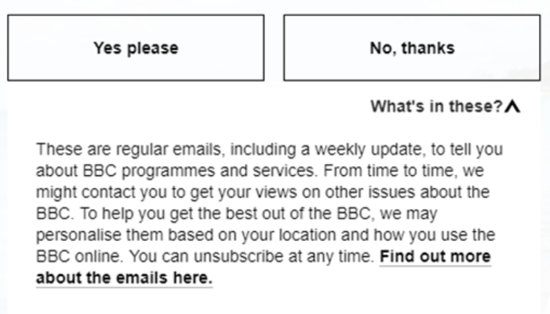 على سبيل المثال ، توفر BBC لزوارها عملية تسجيل توضح القيمة ، وتوفر إفصاحًا واضحًا عما يمكن توقعه من برنامج البريد الإلكتروني الخاص بهم ، وتتضمن طلب الاشتراك الذي يتطلب من الزائر اتخاذ قرار واع.