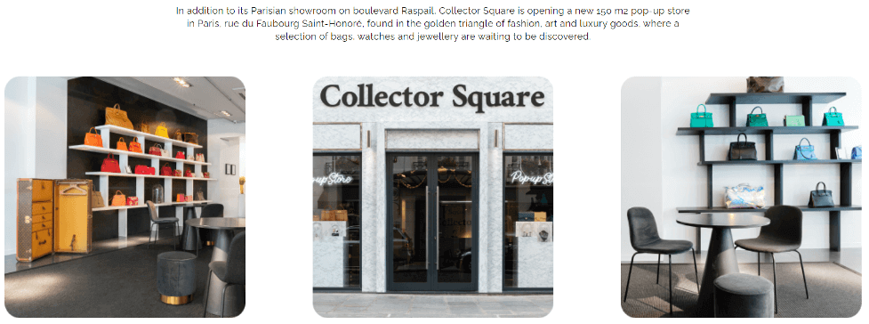 أحد الأمثلة الرائعة للعلامة التجارية التي تستخدم المتاجر المنبثقة بشكل كبير هو Collector Square (انظر أعلاه) ، وهي شركة للتجارة الإلكترونية تبيع سلعًا عتيقة مستعملة باهظة الثمن مثل حقائب اليد والساعات. من خلال اتباع نهج متوسط ، اختارت إنشاء متاجر منبثقة دائمة لتكون بمثابة متاجر وصالات عرض مختلطة. يعرضون العناصر المنسقة حتى يتمكن المتسوقون من التحقق من جودتها وأصالتها ، مما يمنحهم الثقة الكافية لطلب الشراء عبر الإنترنت لاحقًا.