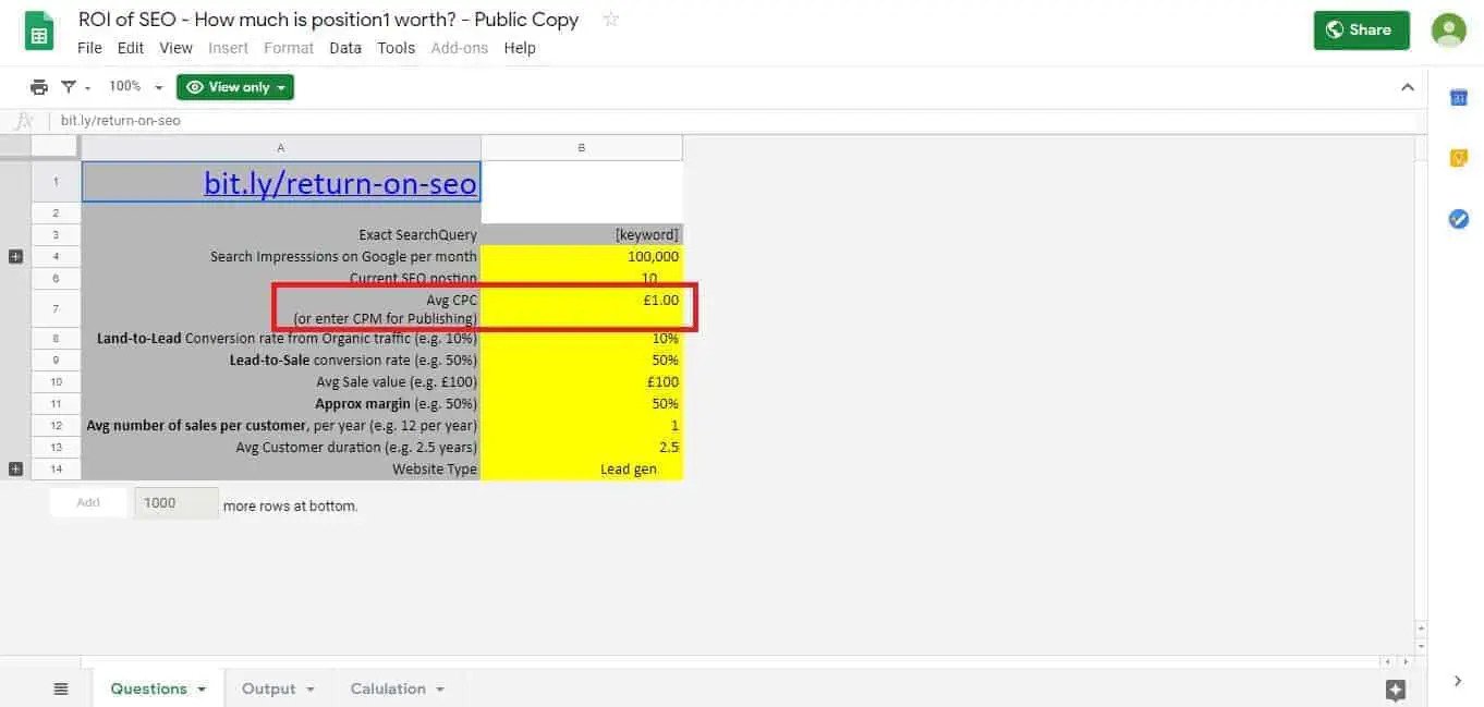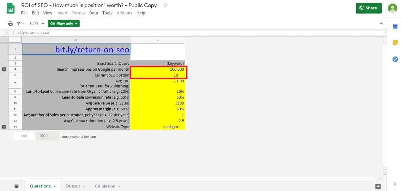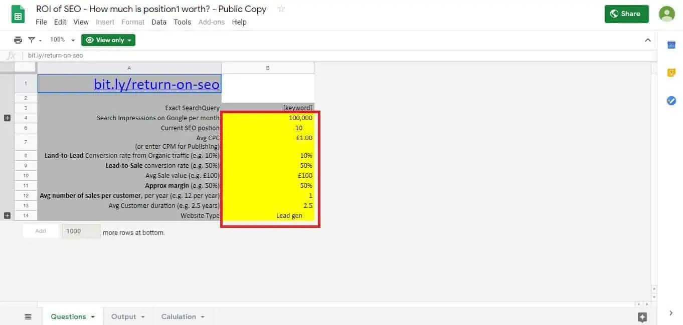 بمجرد الانتهاء من نسختك ، ستتمكن بعد ذلك من تعديل الأشكال في الحقول المميزة باللون الأصفر. هذه الحقول مخصصة لتفاصيل موقعك والتي سيتم استخدامها لإنشاء رسم بياني لعائد الاستثمار في تحسين محركات البحث (SEO ROI). وهي تشمل أشياء مثل مرات ظهور البحث وموضع تحسين محركات البحث ومعدل التحويل.