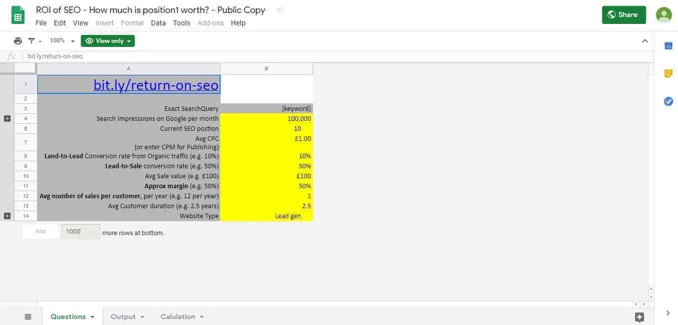 يبدأ إنشاء رسم بياني لعائد الاستثمار لكبار المسئولين الاقتصاديين باستخدام ورقة Google بسيطة. للعثور على الورقة ، كل ما عليك فعله هو التوجه إلى bit.ly/return-on-seo. عندما تفعل ذلك ، سترى شيئًا مثل هذا: