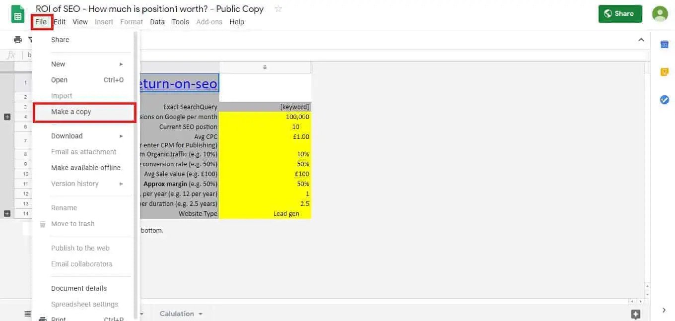 لا يمكن تحرير نسخة الورقة التي تراها أولاً. من أجل القيام بما تحتاجه للورقة لإنشاء الرسم البياني الخاص بك ، عليك أولاً إنشاء نسخة خاصة بك منه. ما عليك سوى النقر فوق "ملف" ثم "إنشاء نسخة" كما هو موضح أدناه: