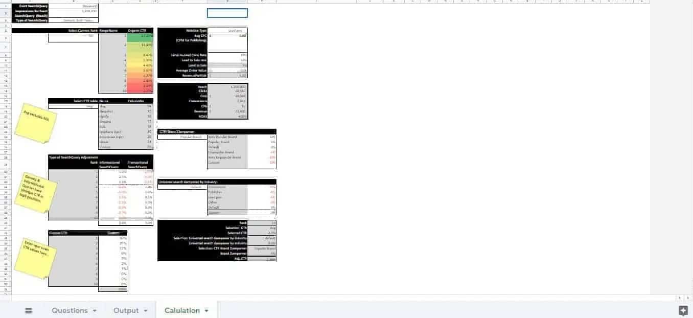 يؤدي القيام بذلك إلى زيادة صعوبة معرفة الأرقام الدقيقة لإدخالها في كل حقل. على سبيل المثال ، ستحتاج إلى إدخال تقدير لعدد مرات ظهور البحث الشهرية على Google عبر العبارات. سيتعين عليك أيضًا أن تأخذ متوسط موضع تحسين محركات البحث الحالي للعبارات. في المثال أدناه ، تم أخذ التقدير والمتوسط على التوالي على أنه 100000 والموضع 10.