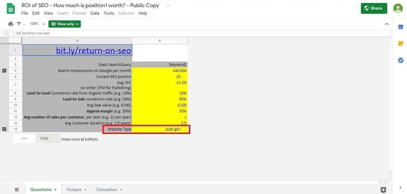 آخر شيء تفعله بالجدول الموجود في ورقة google هو اختيار نوع موقع الويب الخاص بك. يحتوي هذا الحقل الأخير على قائمة منسدلة يمكنك من خلالها اختيار الخيار المناسب. في مثالنا ، اخترنا "Lead gen" لأن الأرقام النموذجية التي أدخلناها تخص هذا النوع من المواقع.