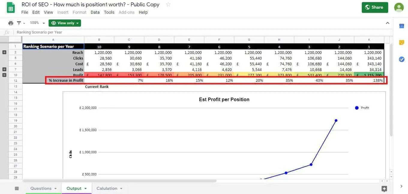 ما يظهره الجدول الموجود أعلى الرسم البياني أيضًا هو النسبة المئوية للزيادة في الربح مع كل قفزة في المركز. هذه معلومة رائعة. يوضح لك مدى قيمة التحسن الطفيف في مُحسّنات محرّكات البحث من حيث أرباحك الإجمالية.