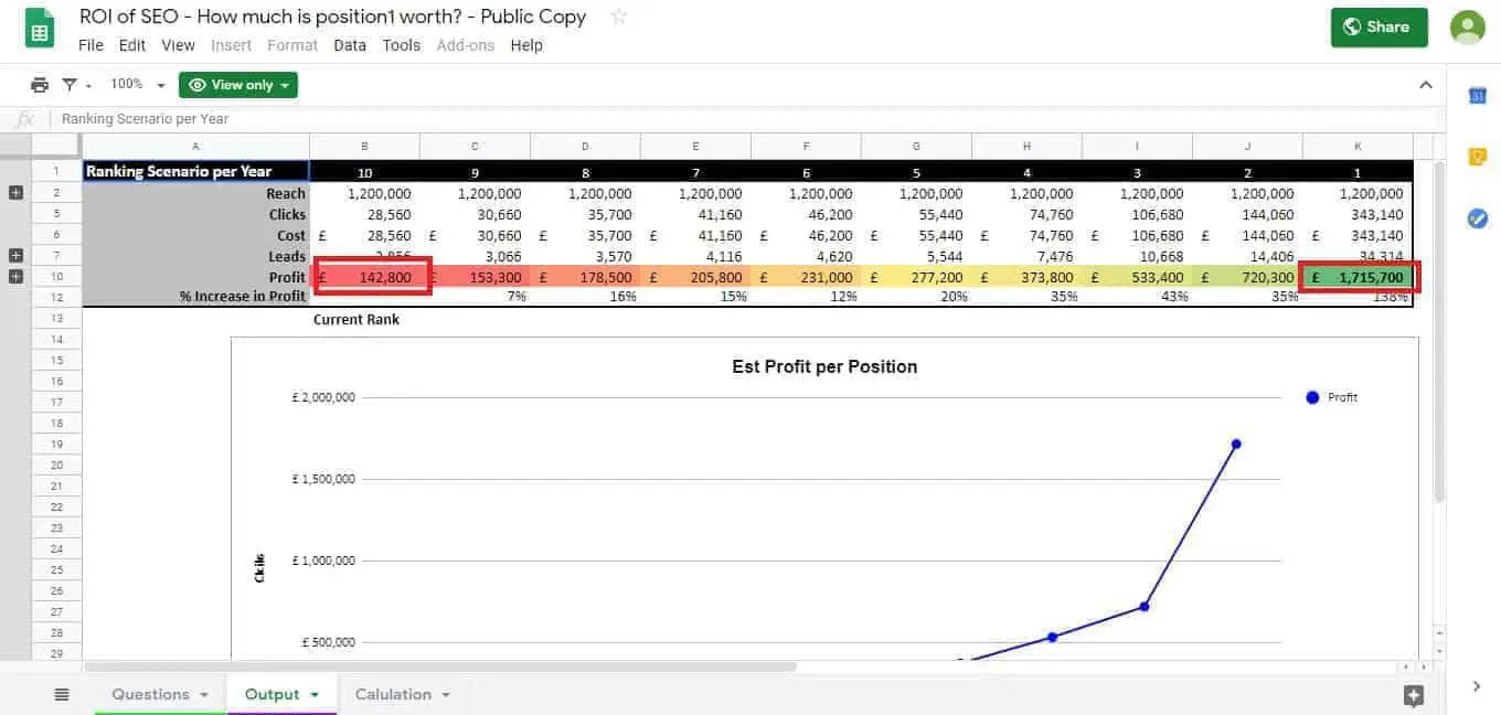 يعرض الرسم البياني ربحًا تقديريًا من خلال وضع الترتيب. سيكون ذلك للكلمة الرئيسية أو مجموعة العبارات التي اخترت التركيز عليها. توضح أرقامنا النموذجية أن المركز العاشر سيحقق ربحًا قدره 142،800 جنيه إسترليني. المركز الأول ، في المقابل ، سينتج عنه أرباح قدرها 1.715.700 جنيه إسترليني. هذا يضع قيمة نقدية - مهمة جدًا - على الارتقاء في تصنيفات SERP.