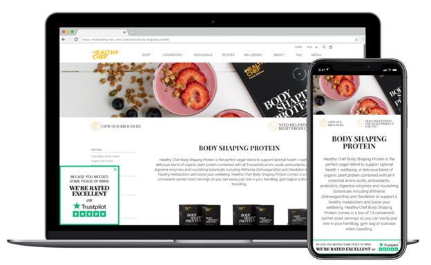 في مثال الدليل الاجتماعي أدناه ، عززت شركة Healthy Chef المتميزة للأطعمة الكاملة والوصفات الإيرادات بنسبة 50٪ من خلال إظهار تذكير للعملاء بمدى تقييمهم الجيد على TrustPilot. في قطاع الصحة والعافية ، يعد الدليل الاجتماعي وشهادات العملاء أمرًا مهمًا بشكل استثنائي عند إظهار القيمة المحتملة للمستهلكين ، لذا فقد نجح هذا الأسلوب في العلاج.