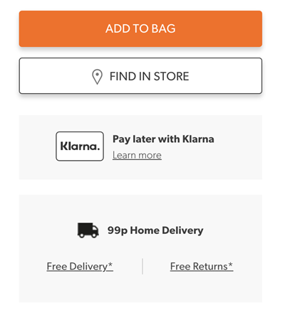 مرة أخرى في مثال New Look أدناه ، إذا كانت صفحة منتجك تحتوي على عدد من العبارات المختلفة التي تحث المستخدم على اتخاذ إجراء ، مثل العثور عليها في متجر محلي ، أو خيارات لإضافتها إلى قائمة الرغبات ، فتأكد من تمييز CTA الأساسي عن الآخرين عن طريق وضع علامة بلون أو حجم مختلف.