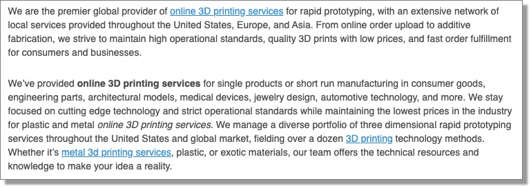 يفتخر مكتب الخدمة هذا "بأقل الأسعار في الصناعة لخدمات الطباعة ثلاثية الأبعاد عبر الإنترنت للبلاستيك والمعادن." الخصم هو وضع كسول.