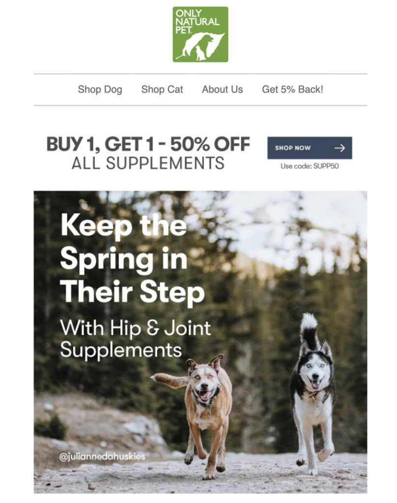 إذا كانت صورهم عالية الجودة ، فيمكنك التواصل مع عملائك والسؤال عن إبراز صورهم في جهودك التسويقية. إن تضمين علامة @ الخاصة بهم يجعله مربحًا للطرفين في الحصول على مزيد من التعرض أيضًا ، كما يفعل Only Natural Pet مع صورتهم البطل: