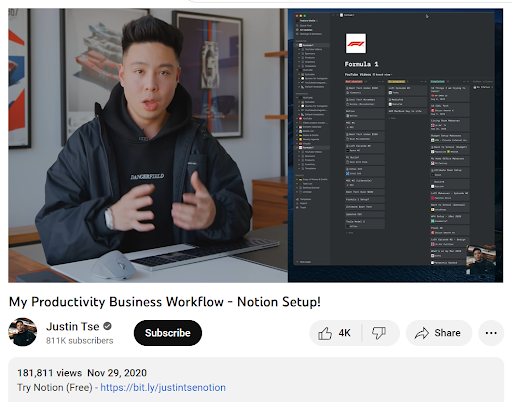 هذا مثال رائع للمحتوى التعليمي لجوستين تسي . تعاون مع Notion لإنشاء مقطع فيديو مدته 20 دقيقة ، حيث شارك عمليته الخاصة في استخدام Notion لاحتياجات العمل المتعددة. يمكن أن يساعد هذا مستخدمي Notion الجدد في التقاط نصائح رائعة للحصول على أفضل النتائج من الأداة.