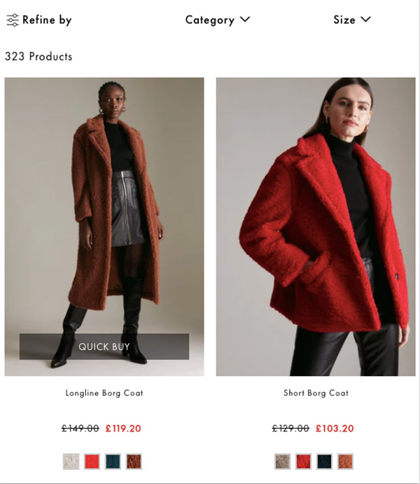 Damit meinen wir, dass alles, was anklickbar ist, weniger Klicks erfordert und es den Benutzern erleichtert, den nächsten Schritt zu tun, ohne den nächsten Schritt zu tun. Es könnte sein, dass jemand mit der Maus über ein Produkt fährt und Details oder Produkte in verschiedenen Einstellungen sieht, ohne darauf zu klicken, oder er kann eine schnelle Ansicht der Produktdetails sehen und den Kauf tätigen, wodurch die Anzahl der Klicks reduziert wird, um dorthin zu gelangen.