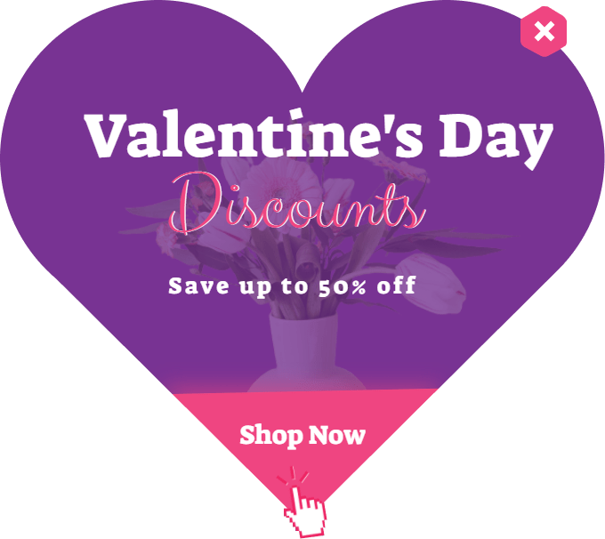 Ziehen Sie Liebhaber, die nach Valentinstagsangeboten suchen, mit diesem herzförmigen Popup in Ihr Online-Schaufenster. Um es noch süßer zu machen, haben wir dieser Vorlage einen Rabatt hinzugefügt, um sie verlockender zu machen.