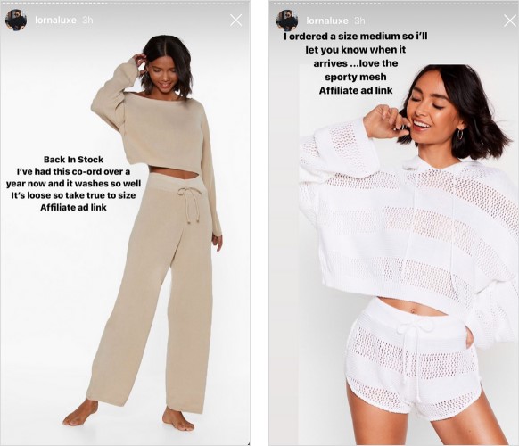 Die Überprüfung von Produkten in Echtzeit ist eine großartige Möglichkeit, die Vorteile und Vorteile eines Produkts aufzuzeigen. Die besten Influencer verknüpfen die Produktbewertung mit einem großartigen Testimonial, fabelhaften Fotos, Demonstrationen und einem Aufruf zum Handeln. Diese Methode des Sales Funneling ist sehr effektiv, wenn sie authentisch und personalisiert durchgeführt wird. Sehen Sie unten, wie Lorna Luxe ihre Instagram-Geschichten verwendet, um Testimonials zu posten und für Affiliate-Produkte zu werben.