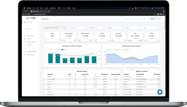 WeCanTrack ist eine kostenlose Affiliate-Software, die bei der Skalierung und Optimierung von Marketingkampagnen und Affiliate-Publisher hilft. Alle Ihre Verkehrsdaten und Affiliate-Conversions können auf einem einzigen Affiliate-Dashboard angezeigt werden. Darüber hinaus ermöglicht Ihnen das Programm, ausgefeilte Marketing-Tools aufeinander abzustimmen, um die Effizienz des digitalen Marketings zu steigern.