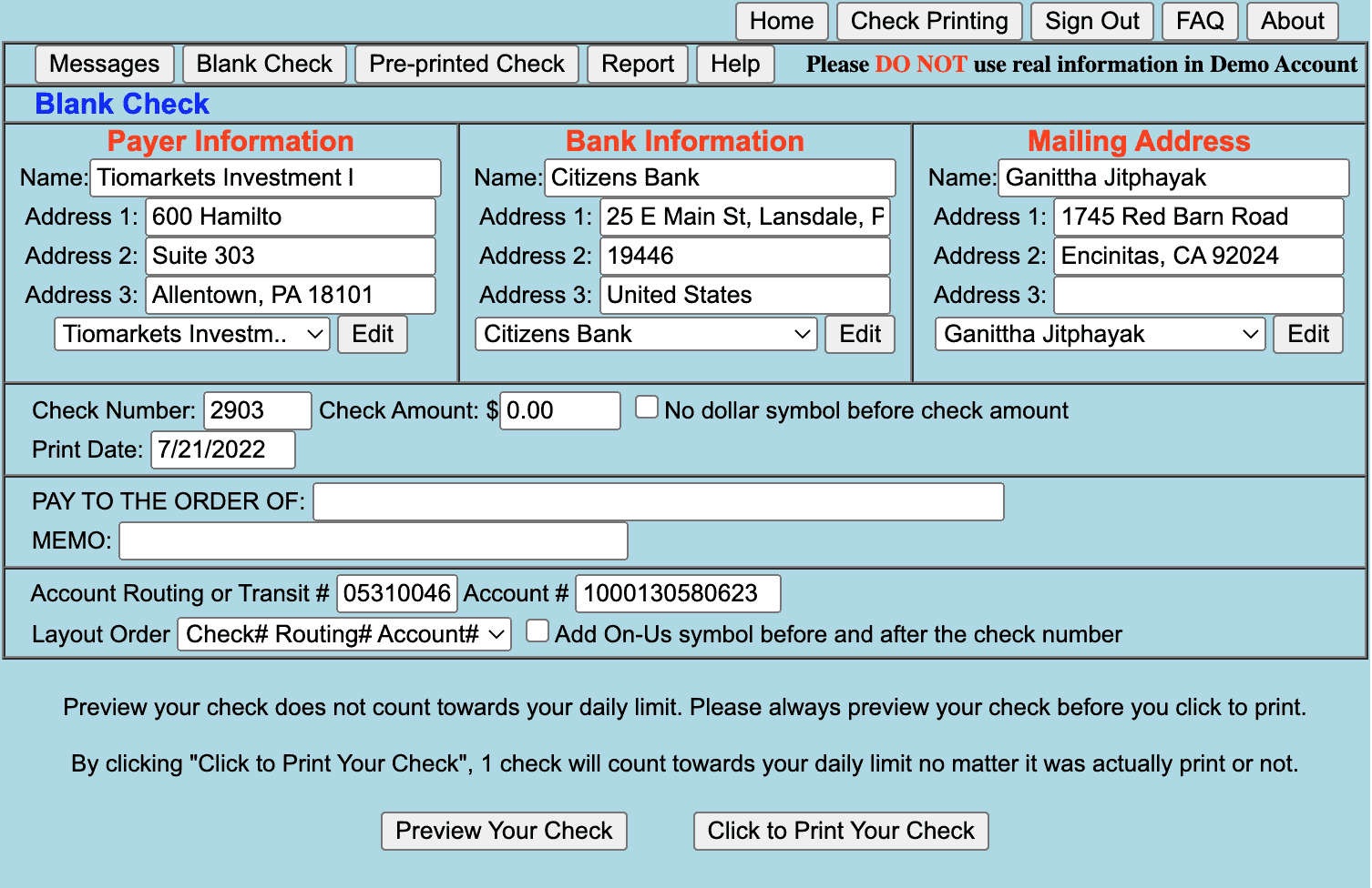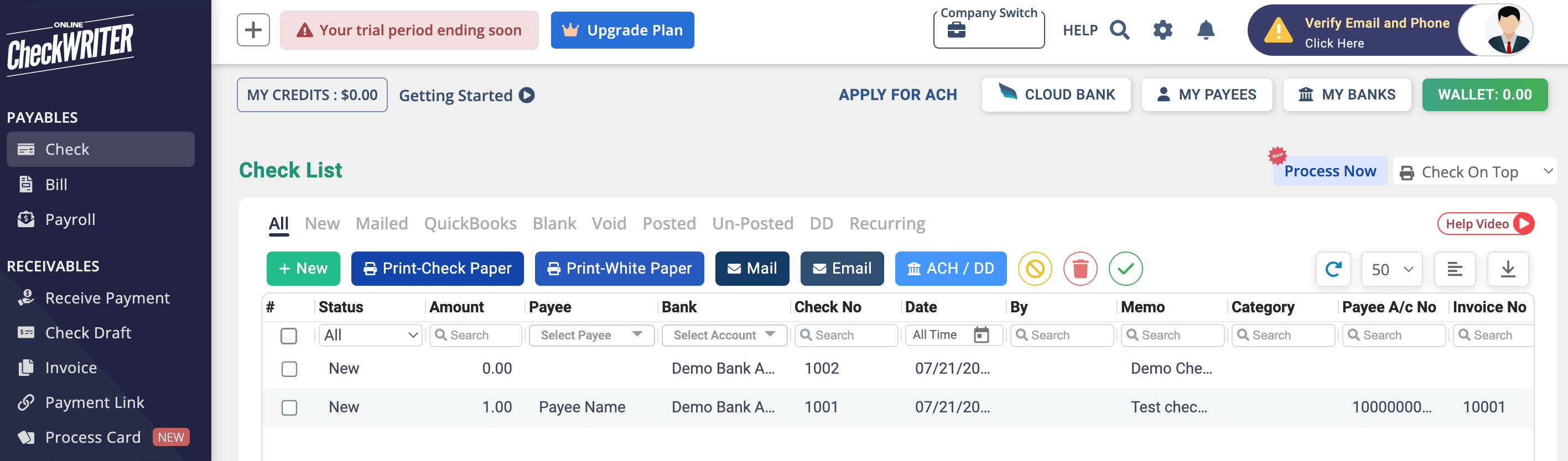 Diese kostenlose Option zum Drucken von Gehaltsschecks ist perfekt, wenn Sie nur gelegentlich Schecks von einem einzigen Geschäftskonto ausdrucken müssen. Es ist einfach, ein kostenloses Konto einzurichten und mit dem Drucken zu beginnen. Print Check Online hat auch ein Demo-Konto, das es potenziellen Kunden ermöglicht, mit der Benutzeroberfläche herumzuspielen, um sicherzustellen, dass sie einfach und intuitiv ist.