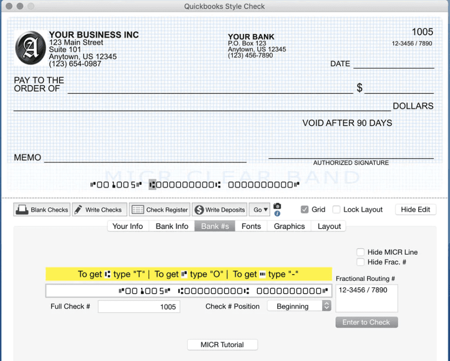 • Verwenden Sie Blankoscheckvorrat oder Quicken-kompatible vorgedruckte Schecks in Geschäfts-/persönlicher Größe.