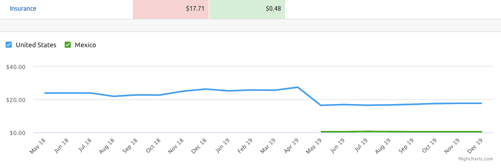 Abgesehen davon ist es auch sehr wichtig, was Sie an einem bestimmten Ort bewerben. Beispielsweise müssen Sie in den USA durchschnittlich 17,71 US-Dollar pro Klick zahlen, um für Ihr Versicherungsgeschäft zu werben, während es in Mexiko nur 0,48 US-Dollar pro Klick kostet.