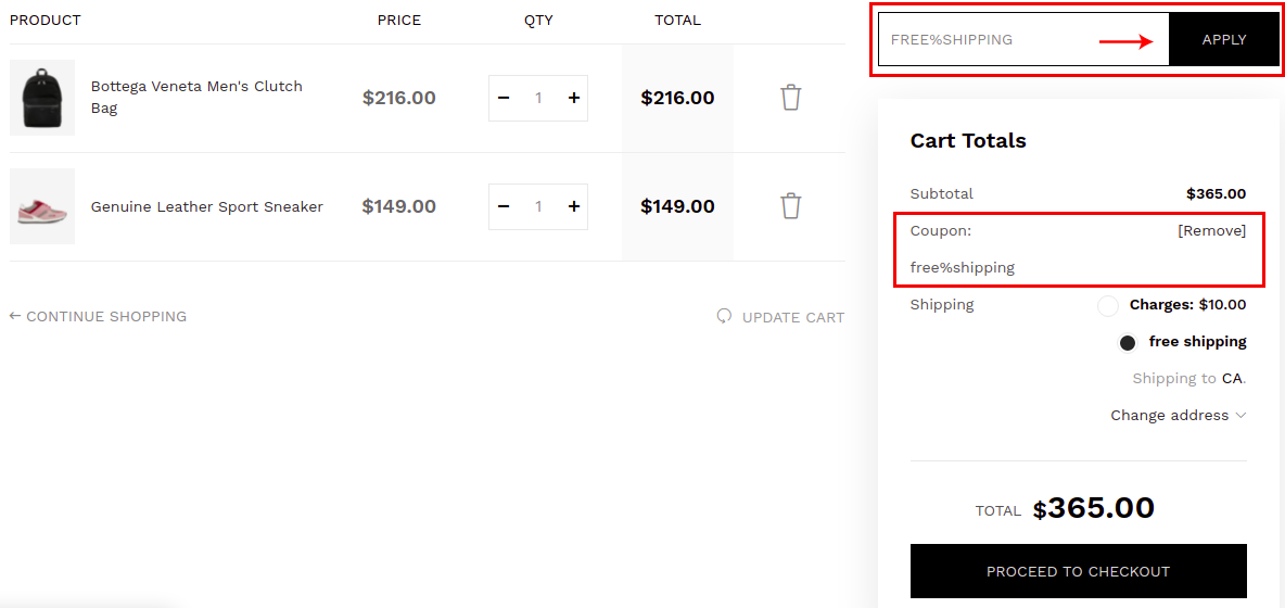 Hier ist beispielsweise ein Beispiel für eine Warenkorbseite, auf der der Gutscheincode „Kostenloser Versand“ generiert und auf den Warenkorb des Käufers angewendet wird.