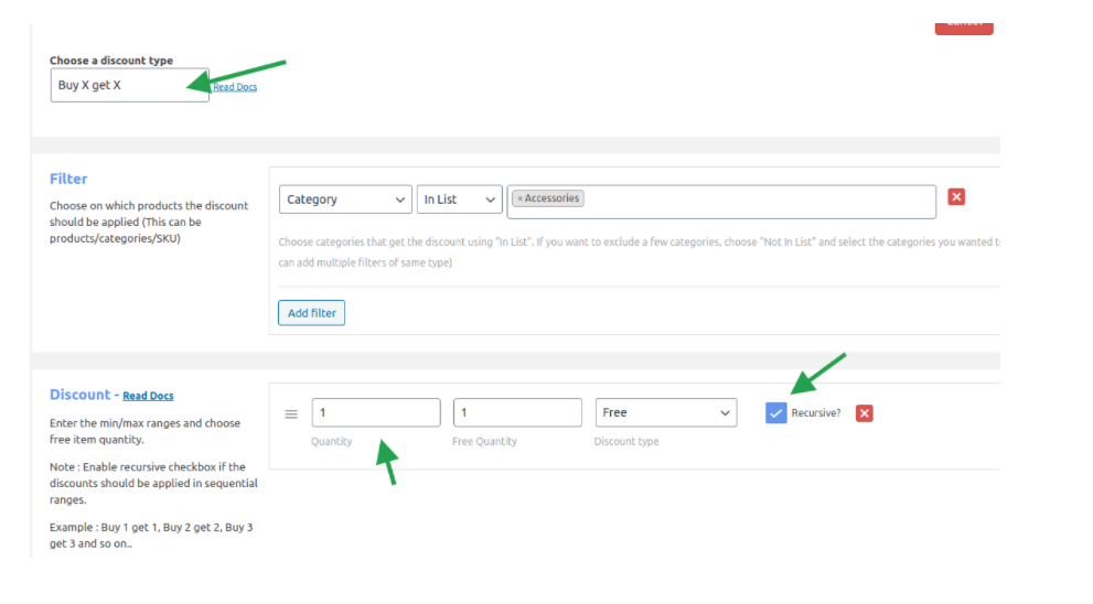 Aktivieren Sie das rekursive Kontrollkästchen, da es die zusätzlichen kostenlosen Mengen für zusätzlich gekaufte Mengen wie 3 kaufen und 3 erhalten, 4 kaufen und 4 erhalten usw. sicherstellt.