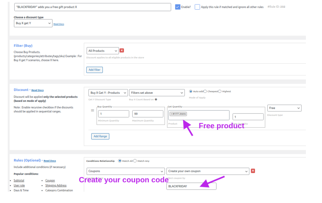 Generieren Sie einen Gutscheincode für BLACKFRIDAY, der ein kostenloses Produkt X gibt.