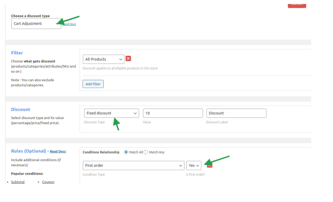 Erstellen Sie so viele Bedingungen pro Regel, wie Sie benötigen. Aber der Diskontsatz ist derselbe. Sie können nicht einen Rabattsatz für eine Bedingung und einen anderen Rabattsatz für eine andere Bedingung anwenden.
