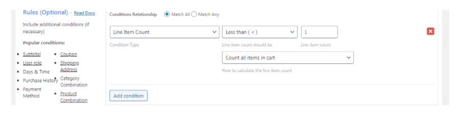 Stellen Sie den Bedingungstyp auf Artikelmenge ein, wählen Sie die Anzahl der Einzelposten als kleiner als Wert aus, geben Sie die Anzahl der Einzelposten ein und lassen Sie die Regel alle Artikel im Warenkorb zählen.
