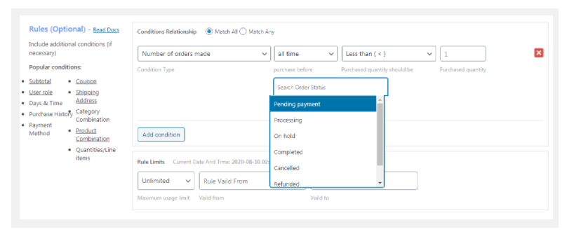 Bei diesem Typ können Sie einen Gutschein erstellen und ihn konditionieren, indem Sie den ausgegebenen Gesamtbetrag oder die Gesamtzahl der getätigten Bestellungen angeben und den Bestellstatus überprüfen.