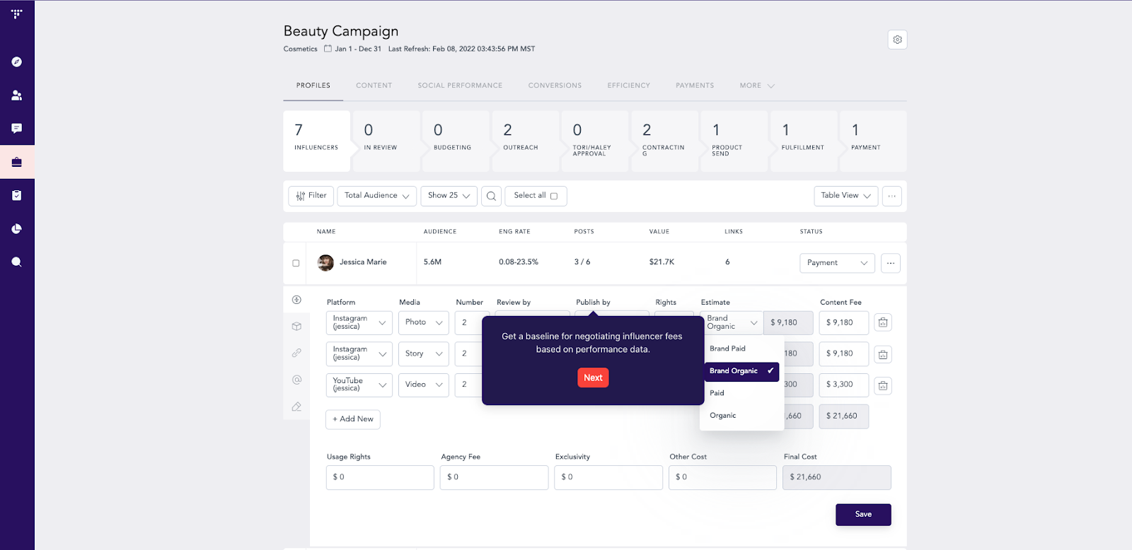 Profi-Tipp : Traackr bietet einen Budgetrechner, der auf einer Kombination aus Followern, Engagement, vergangener Leistung und mehr basiert, um eine Vergütung für gesponserte und organische Inhalte zu empfehlen. Mit dieser Art von Werkzeug können Sie Zeit (und viele Kopfschmerzen) sparen!