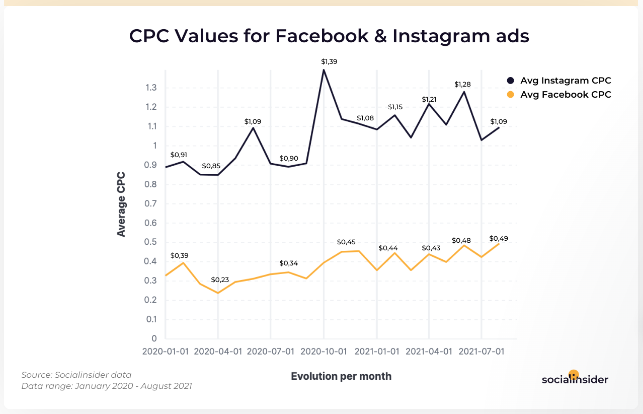 Eine Studie von Socialinsider ergab, dass der durchschnittliche CPC für Facebook-Anzeigen 0,49 $ beträgt, während der für Instagram 1,09 $ beträgt. Da Instagram höhere Kosten pro Klick hat als Facebook, müssen Sie Ihr Targeting verbessern, um sicherzustellen, dass die Klicks, die Sie anziehen, von hoher Qualität sind.