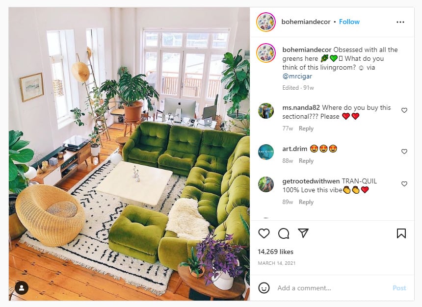 Im Allgemeinen dreht sich beim Instagram-Engagement alles um Beobachtung, Inspiration und Entdeckung. Bohemian Decor (@bohemiandecor) möchte Nutzer mit eleganten Innendesign-Fotos auf Instagram inspirieren.