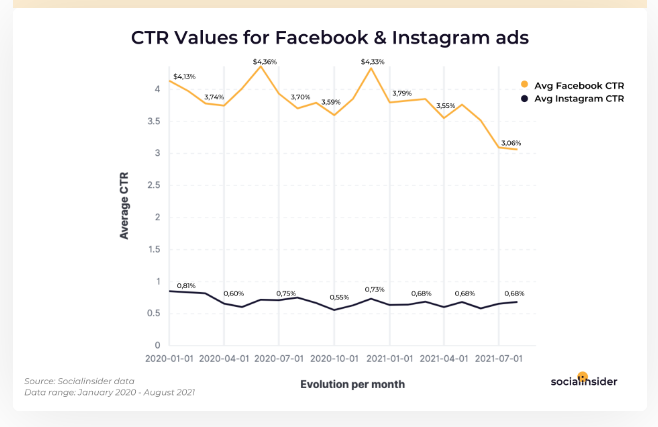 Facebook hat auch eine höhere Klickrate als Instagram. Die durchschnittliche CTR für Facebook-Werbekampagnen beträgt 3,06 %, während die von Instagram 0,68 % beträgt.