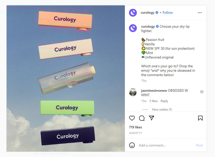Die Make-up-Marke Curology (@curology) spricht ihr junges Millennial-Publikum mit farbenfrohen Bildern und einprägsamen Bildunterschriften auf Instagram an.