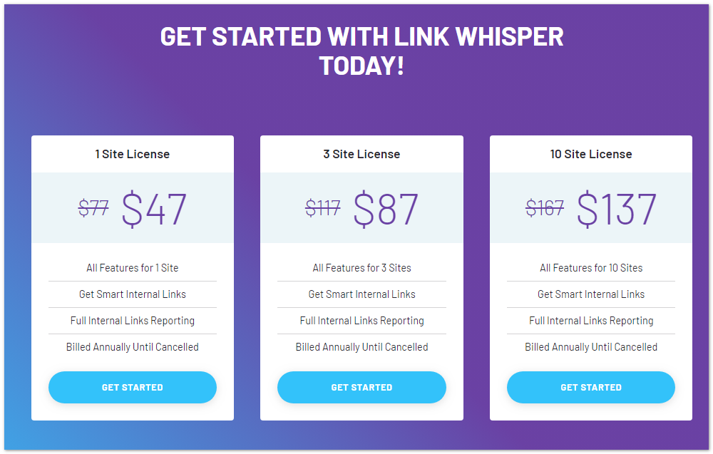 Schritt 2: Sie haben nun die Preisseite von Link Whisper erreicht. Wählen Sie dann den Plan aus, indem Sie auf die Schaltfläche „ Erste Schritte “ klicken.