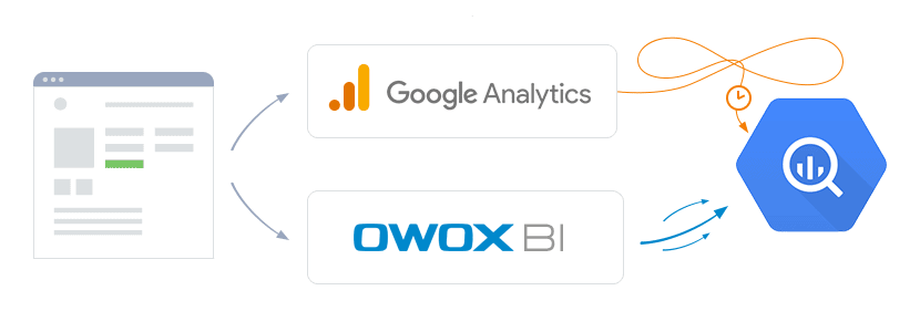 OWOX BI sammelt auch Daten zum Benutzerverhalten in Google BigQuery, aber es tut dies direkt von Ihrer Website, parallel zum Google Analytics-Tracking. Aus diesem Grund werden Daten schneller aktualisiert als beim Export aus Google Analytics 360, und Sie können sie beispielsweise für Trigger-Mailings und häufig aktualisierte Dashboards verwenden.