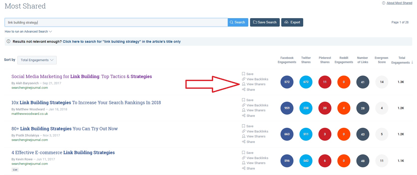 In Buzzsumo suchen Sie nach einem Schlüsselwort und es werden Ihnen die am häufigsten geteilten Inhalte angezeigt. Hier sehen Sie Sharer.