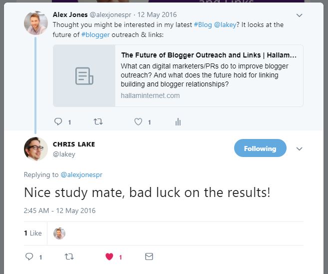 Sobald Sie sie gefunden haben, dreht sich alles um Interaktion. Springen Sie zurück zu Punkt zwei und zum Glück sind Social Media genau der richtige Ort dafür. Verbinden Sie sich mit Bloggern, die Sie ausgewählt haben, und verbringen Sie einige Zeit mit deren Inhalten. Wenn Sie sich dann endlich mit der Bitte um Erwähnung an sie wenden, haben Sie eine viel bessere Chance, eine positive Antwort zu erhalten.