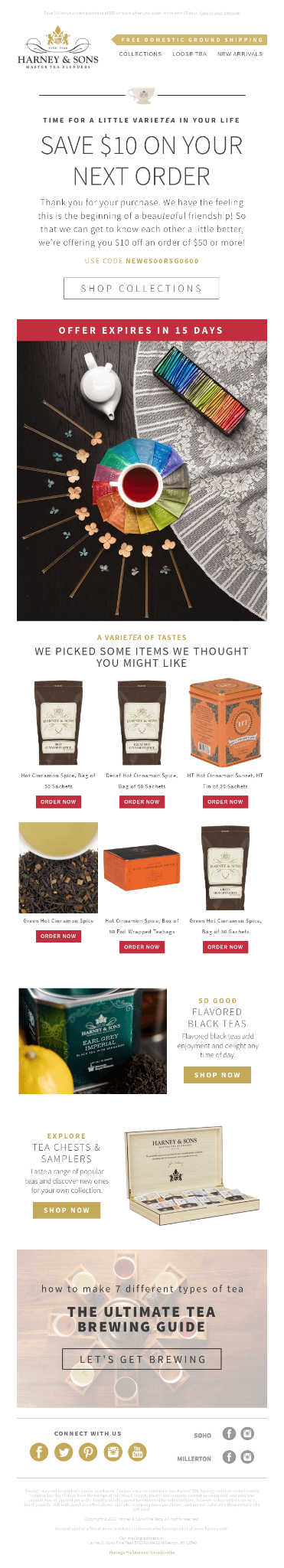 Darüber hinaus ist es eine hervorragende Möglichkeit, Kunden zu einem erneuten Kauf zu animieren. Alles, was Sie tun müssen, ist ein Angebot oder einen Rabattgutschein in Ihre Dankes-E-Mail aufzunehmen und Kunden dazu zu verleiten, wiederzukommen und einzukaufen. So hat es die Teemarke Harney and Sons gemacht.