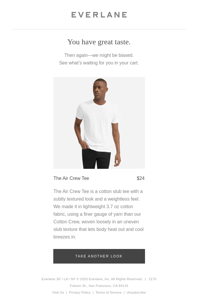 Sehen Sie, wie Everlane E-Mails mit aufgegebenen Warenkörben sinnvoll nutzt, um seine Kunden zurückzugewinnen.