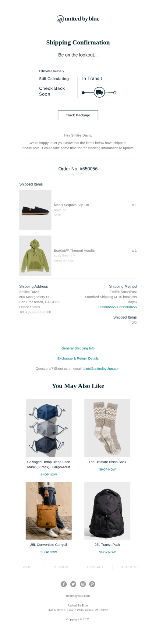 Hier ist eine hervorragende Bestellbestätigungs-E-Mail von United by Blue :