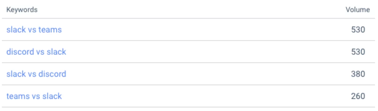 SEO-Teams können Ihnen auch Daten darüber liefern, nach welchen Markenbegriffen Ihre Kunden suchen, sowohl für Ihre eigene Marke als auch für Mitbewerbermarken. Dies kann eine Vielzahl von Vergleichsbegriffen hervorheben, die Ihnen helfen zu verstehen, wie Sie sich in den Köpfen der Kunden derzeit gegen Ihre Konkurrenten behaupten. Wir können dann tiefer in die Keyword-Analyse eintauchen. Nehmen Sie zum Beispiel das beliebte Kommunikationsverwaltungstool Slack: