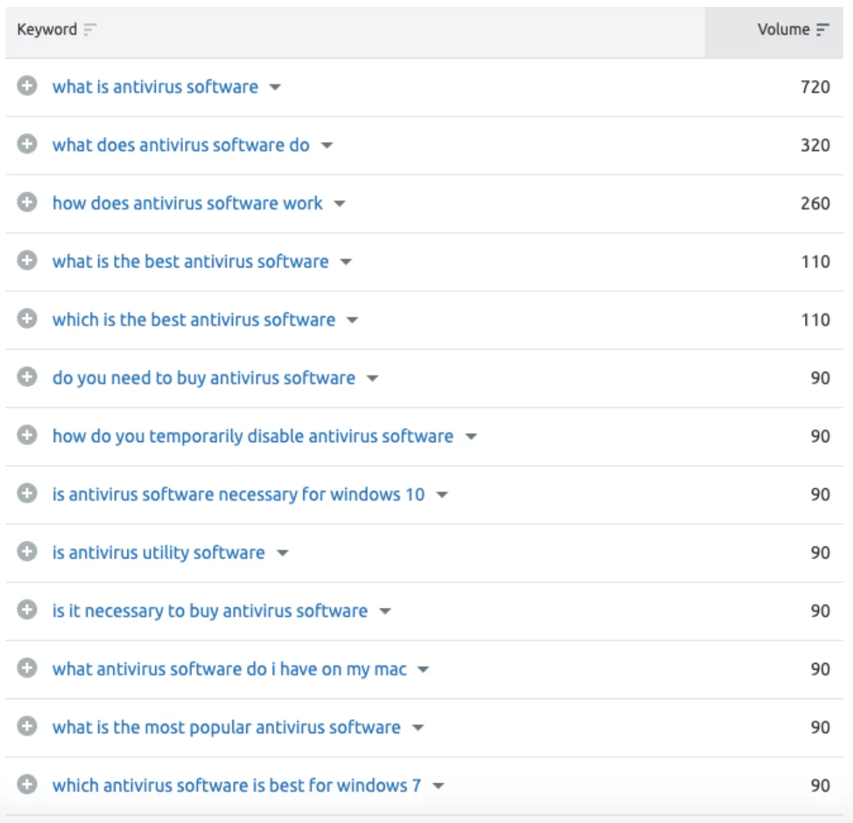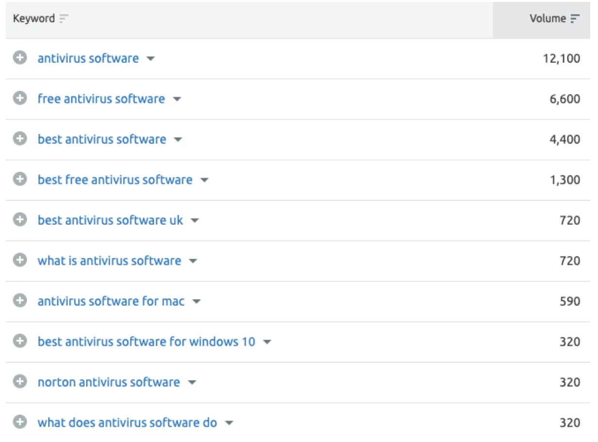 Nehmen Sie als Beispiel „Antivirensoftware“, unten sehen Sie eine Liste der häufigsten Suchbegriffe und Fragen: