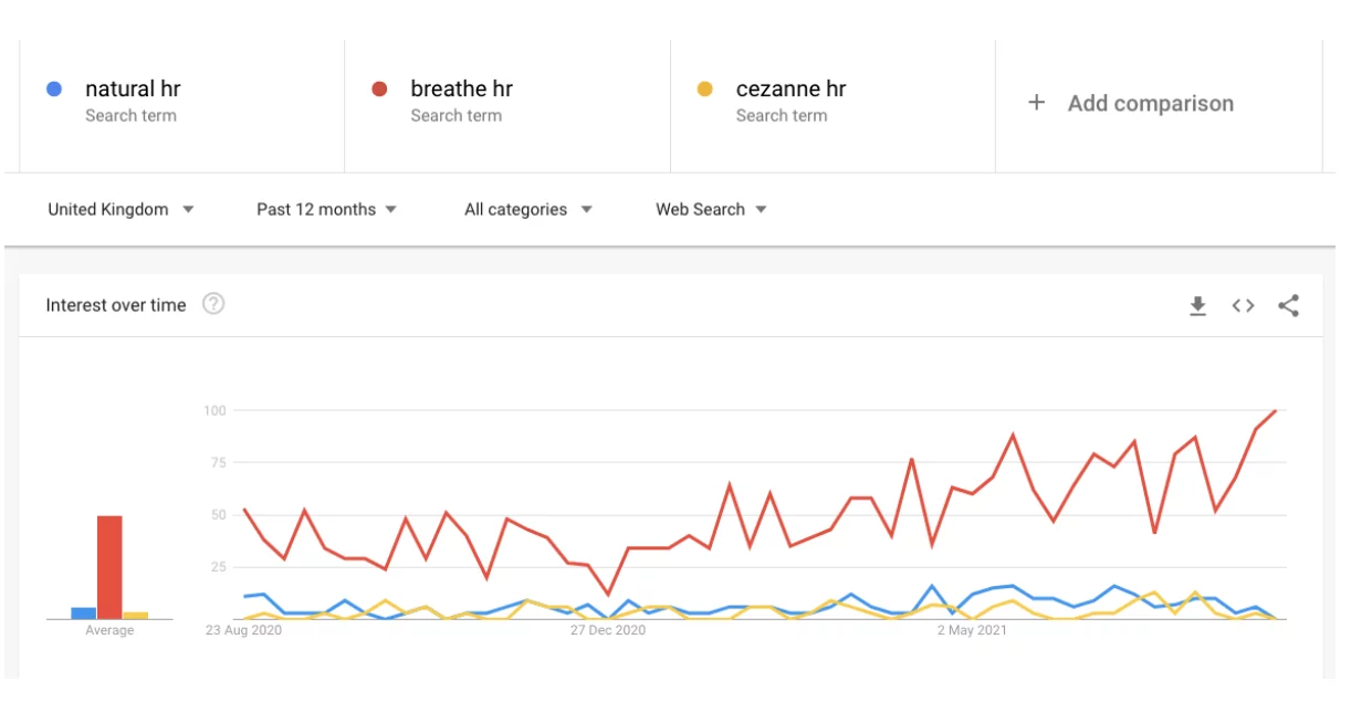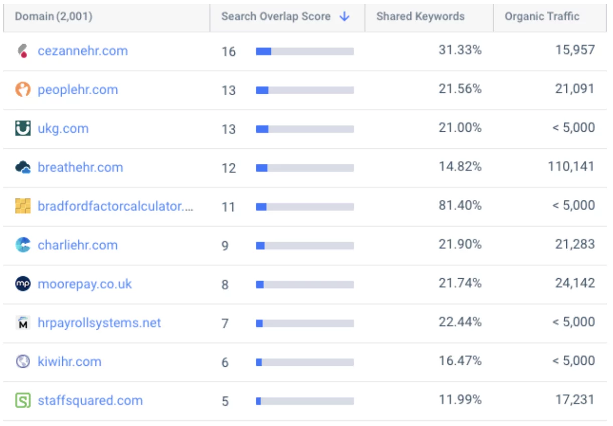 Hier ist ein Beispiel für den HR-Softwaremarkt in Großbritannien für einen führenden Anbieter, Natural HR. Mit einem SEO-Forschungstool können wir verstehen, wer die Top-10-Konkurrenten in Bezug auf die organische Suche sind: