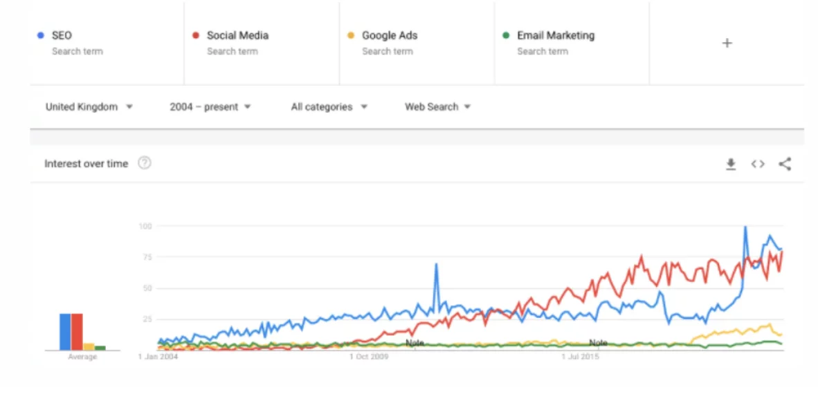 Sie können Google Trends auch für breitere Themensuchen verwenden, um zu verstehen, wie die mit Ihrem Unternehmen, Ihren Produkten und Dienstleistungen verbundenen Themen im Laufe der Zeit bei den Suchenden an Interesse gewonnen oder abgenommen haben. Nehmen Sie das folgende Beispiel aus der Welt des digitalen Marketings – diese Daten wären besonders interessant für eine Agentur, die möglicherweise ihre Dienstleistungen erweitern oder auswählen möchte, welche sie verdoppeln möchten: