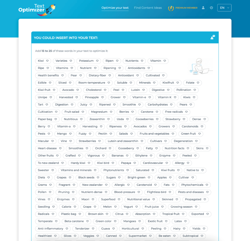 Google hinterlässt Hinweise für Sie, und TextOptimizer schnappt sich diese Hinweise und spuckt sie für Sie aus. Die angezeigten Wörter sind Wörter, die mehreren hochrangigen Seiten zu Ihrem Thema gemeinsam sind, z. B. „Kiwi“, die Frucht.